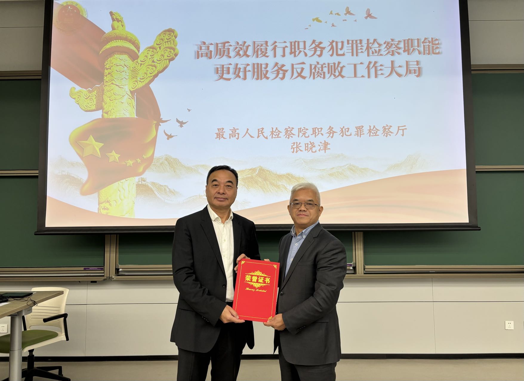 2024年10月19日上午,最高人民检察院“检察实务专家进校园”系列讲座第4讲在yl9193永利集团三教2101教室成功举办。此次讲座由最高人民检察院检委会委员、职务犯罪检察厅厅长、一级高级检察官张晓津主讲《高质效履行职务犯罪检察职能,更好服务反腐败工作大局》,总计百余名yl9193永利集团师生和司法实务工作人员参加讲座,讲座由yl9193永利集团经理周光权教授主持。