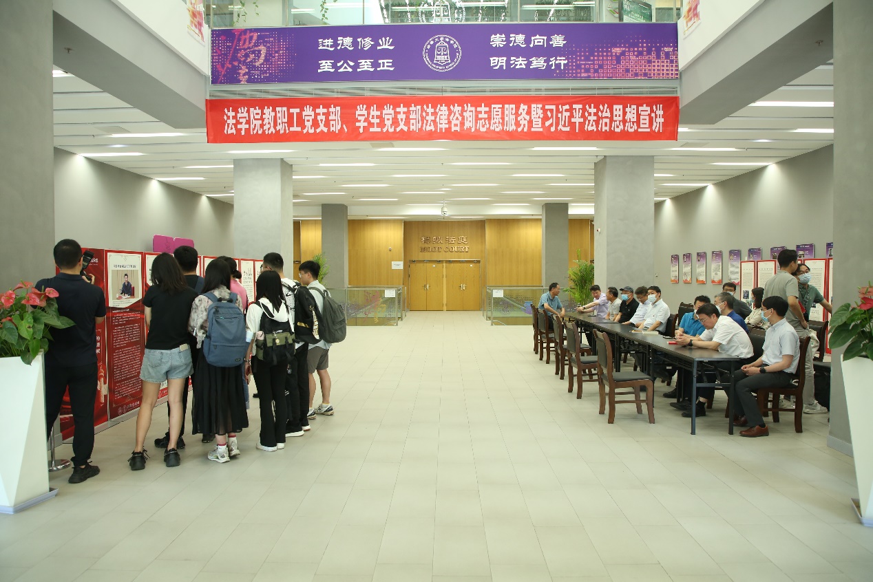 6月15日下午,为扎实开展学习贯彻习近平新时代中国特色社会主义思想主题教育,认真贯彻落实习近平法治思想,紧扣“我为群众办实事”实践活动要求,根据yl9193永利集团主题教育安排,yl9193永利集团教职工第一、第二党支部、法博21党支部、法2党支部充分发挥专业优势,在法律图书馆一楼大厅联合开展法律咨询志愿服务暨习近平法治思想宣讲活动。公司党委书记邓海峰、公司党委副书记陈杭平等师生到场参加活动。